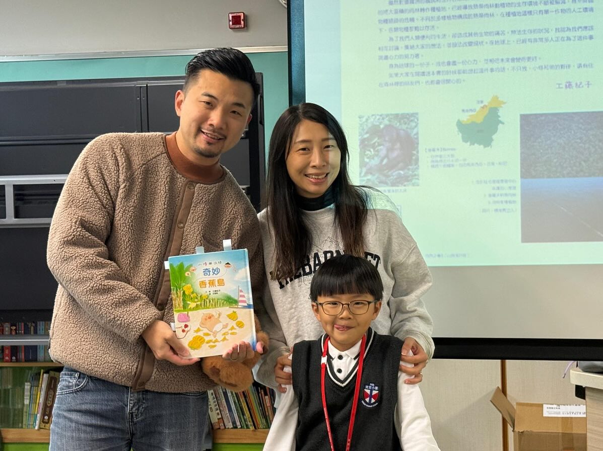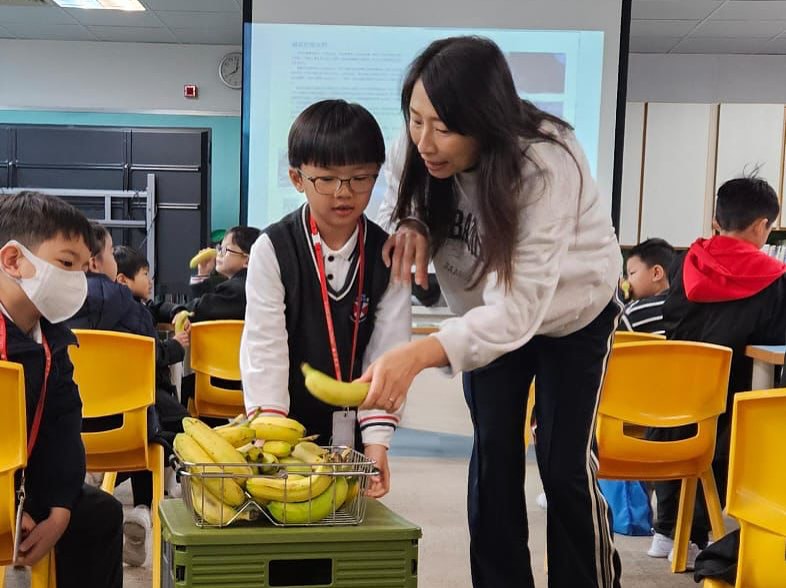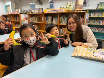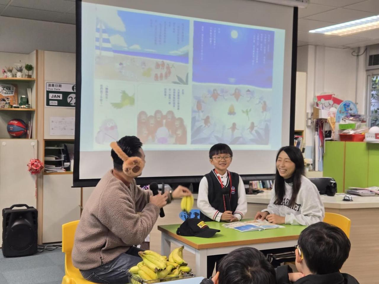 1B朱浩翹一家於1月9日(星期五)透過分享《奇妙香蕉島》,傳遞環境保育的訊息,更準備了香蕉與大家一邊閱讀,一邊分甘同味。