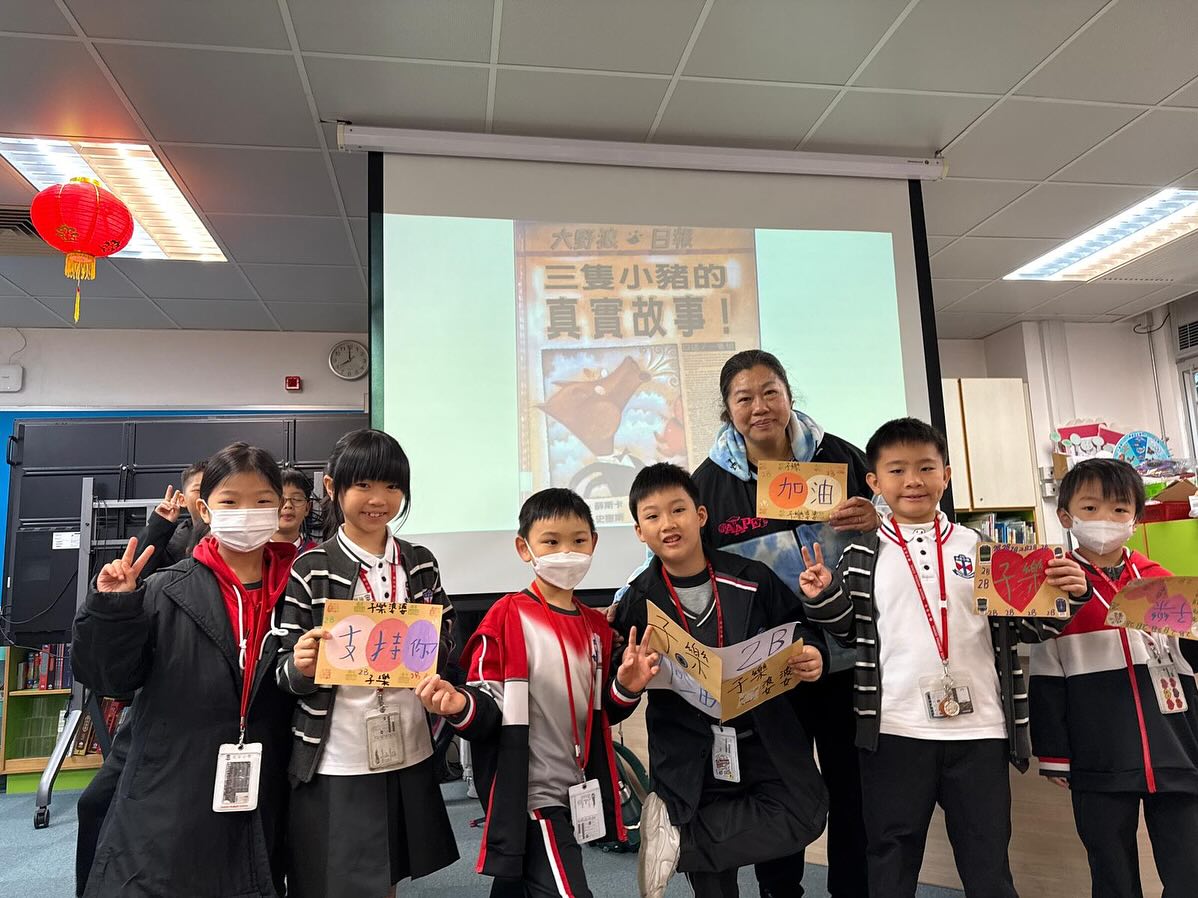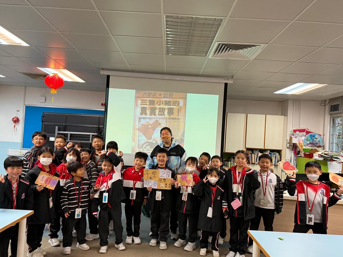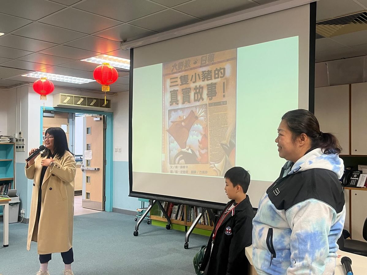 2B易子樂與婆婆則於1月16日(星期五)進行親子閱讀分享,他們帶來別具創意的改編《三隻小豬的真實故事》,並貼心地與同學們分享豬肉乾。