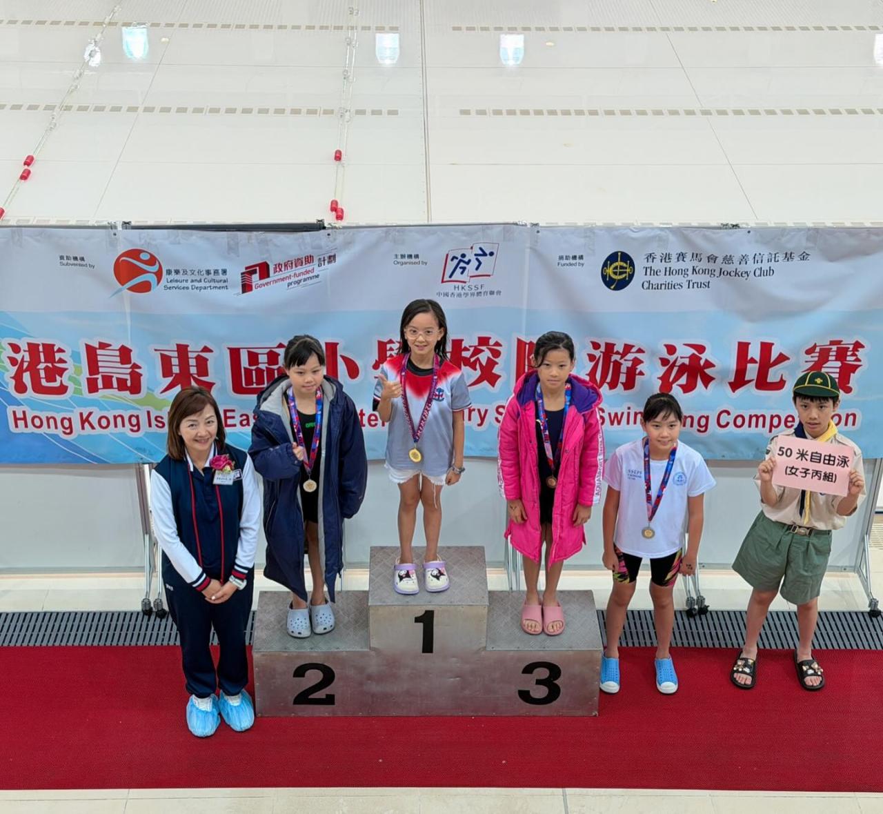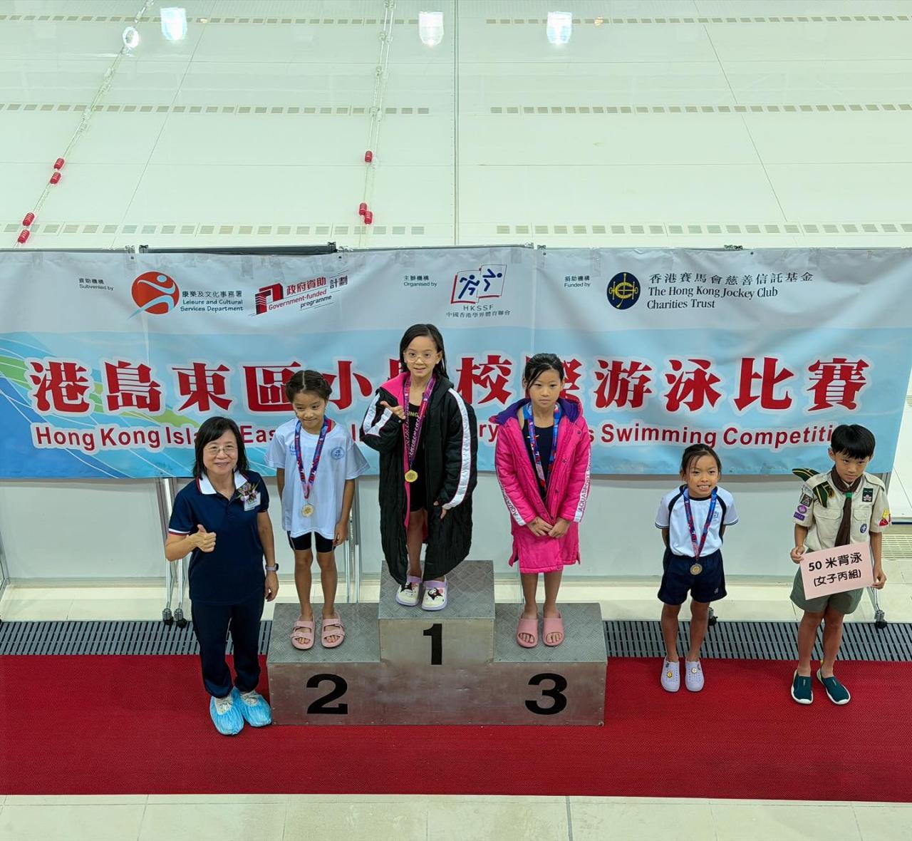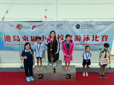 其中4E陳芍嵐同學更以破大會紀錄的成績榮獲傑出運動員,並獲邀代表港島東區參與全港小學區際游泳比賽。