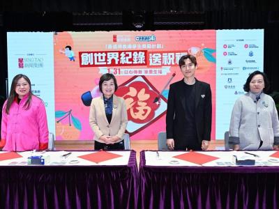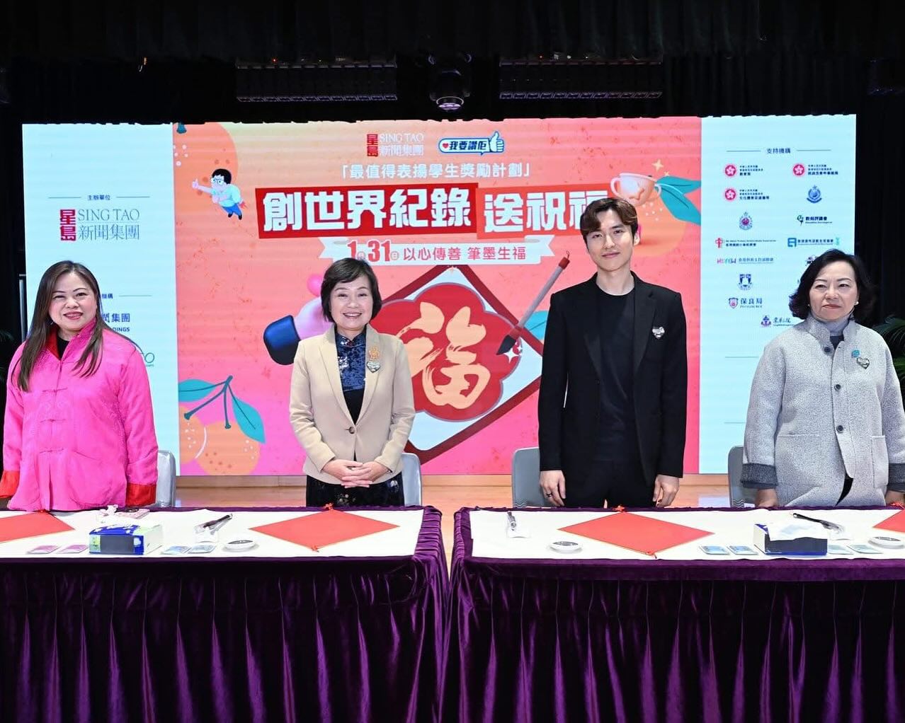 是次活動由星島新聞集團策劃,教育局局長蔡若蓮女士JP、民政及青年事務局局長麥美娟女士SBS, JP、文化體育及旅遊局局長羅淑佩女士JP蒞臨擔任主禮嘉賓。洺兒與芷穎與現場師生共同以書法筆書寫「福」字,攜手挑戰共創世界紀錄,趁農曆新年來臨之際向全港市民傳遞祝福。