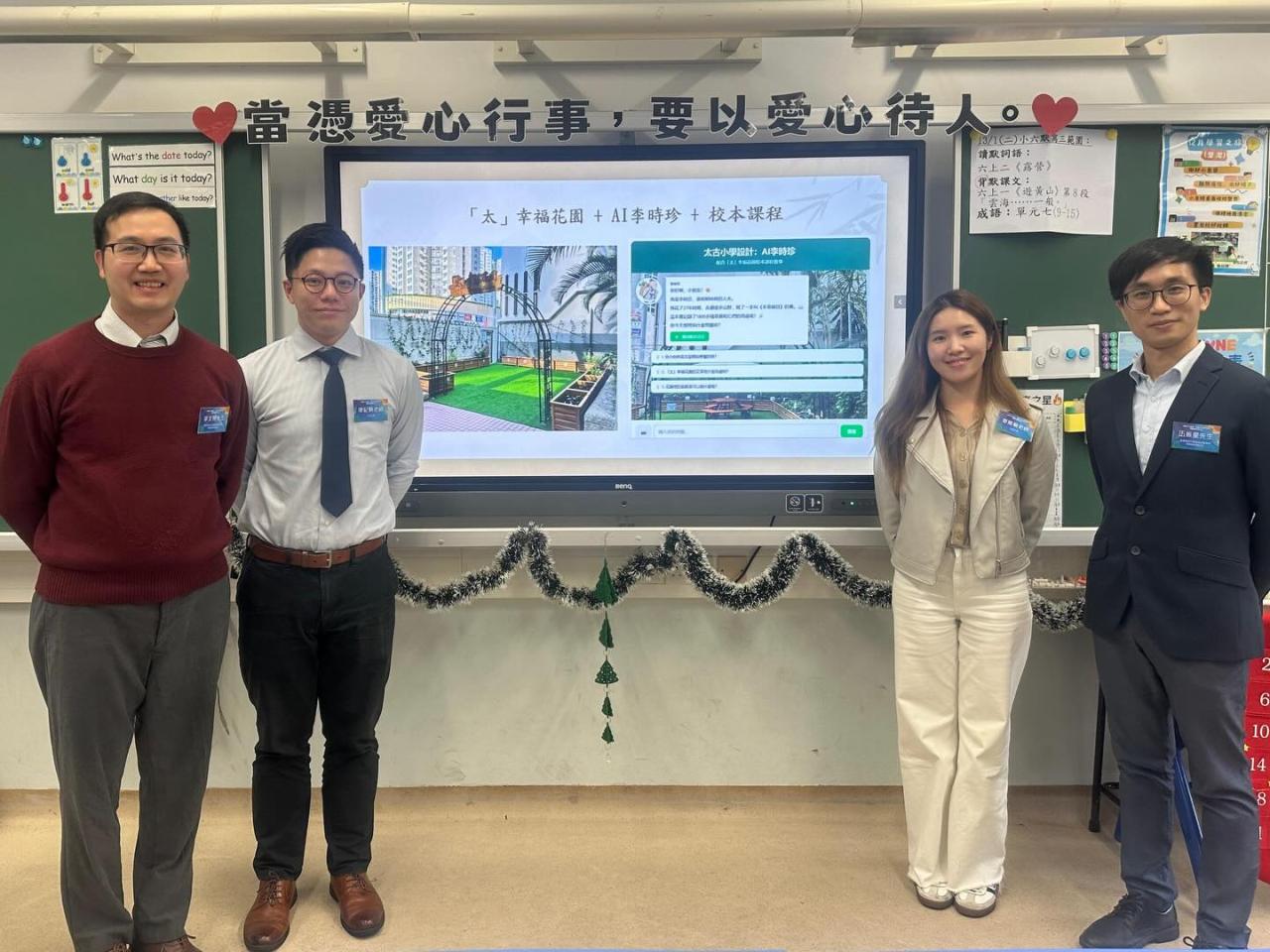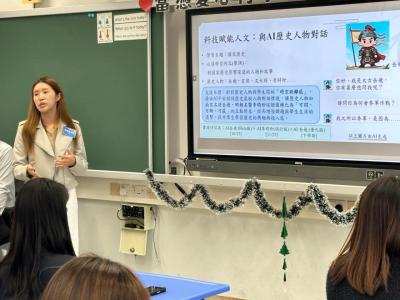 研討會中,本校教師團隊分享了人文科運用人工智能提升學與教效能的經驗,並與友校分享以AI連結校本「太」幸福花園課程而設計的「AI李時珍」。