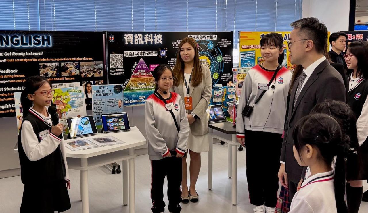 活動期間,施副局長及嘉賓更親身參與多項互動體驗,包括由本校設計海洋保育英文電子遊戲、STEAM課程及學與教活動介紹、暑期自學Scratch遊戲、體驗體育科電子設備、透過與AI李時珍即時對話,認識「太」幸福花園的中草藥課程及欣賞跨課程閱讀片段等。